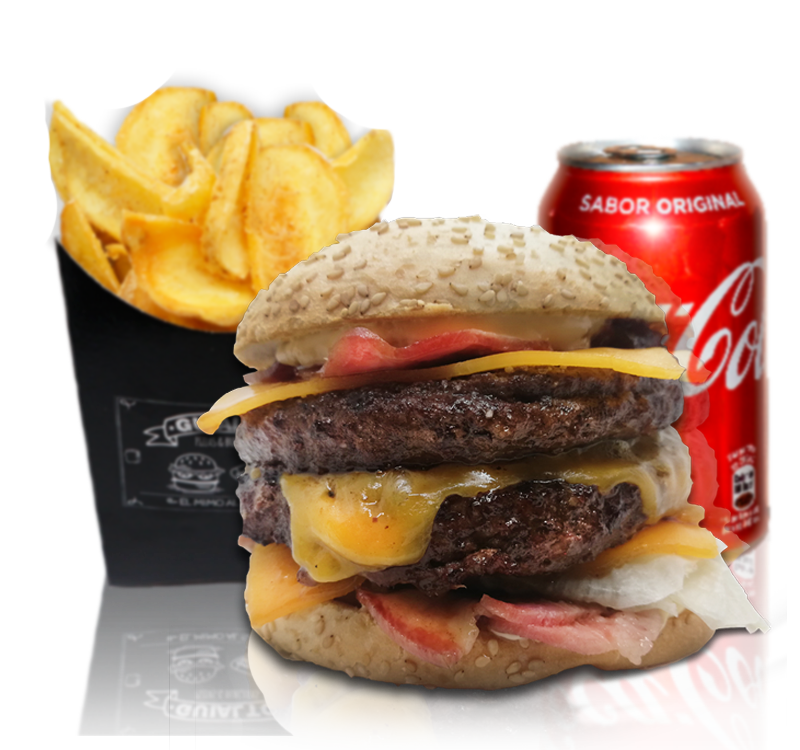 DOBLE DE BUEY… DELICIOSA Pan de Sésamo, 2 Carnes de 220 grm de Buey, Salsa Jack, Triple Cheddar, Doble de Bacon, cebolla Caramelizada y Lechuga Romana.